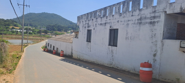 남성리 축사 외벽과 공사차량 운행 도로 (사진 = 윤시현 기자)