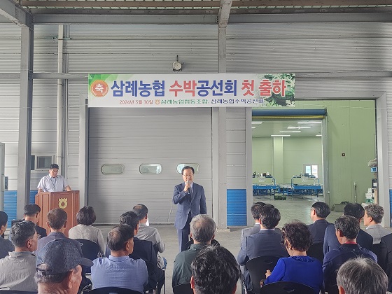 30일 군에 따르면 삼례농협(조합장 강신학), 수박공선회가 삼례농협 산지유통센터에서 삼례수박 출하 기념행사를 열었다.
