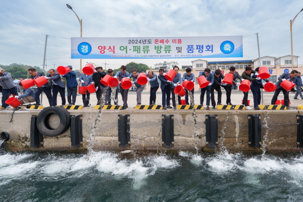이날은 읍천항 내에서 강도다리치어를 1차 방류를 한 후, 어선에 승선하여 어촌계 공동어장인 주변연안에 전복치패와 강도다리치어를 직접 2차 방류를 했다.