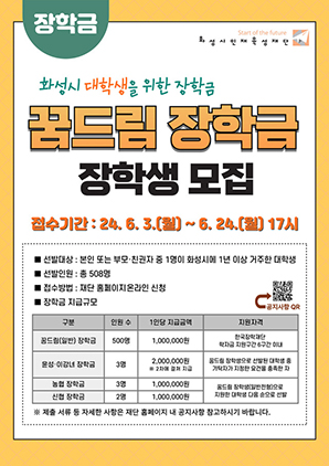 (경기=NSP통신) 조현철 기자 = 경기 화성시인재육성재단(대표 임선일)이 다음달 3일부터 24일까지 2024년 꿈드림 장학생을 모집한다.