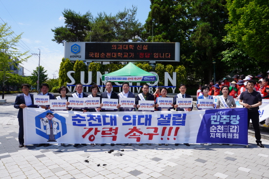 (전남=NSP통신) 김성철 기자 = 더불어민주당 순천·광양·곡성·구례갑 지역위원회(위원장 김문수 국회의원)은 국립순천대학교 정문 앞에서 천막당사 출정식을 열고 국립순천대의 의과대학 유치를 강력하게 촉구했다.