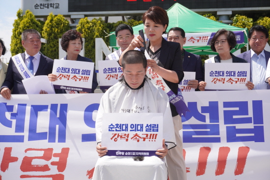 출정식에 참석한 김진남 도의원은 지역민의 의대 유치 요구와 염원을 담아 삭발식을 진행하였으며, “동서 갈등을 부추기는 공모를 즉각 철회하고, 순천대 의대 유치까지 순천시민, 순천갑 지역위원회와 함께 끝까지 싸워나갈 것이다”고 말했다.