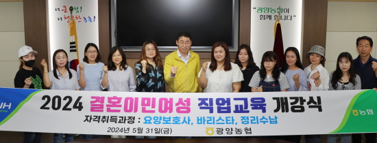 (전남=NSP통신) 김성철 기자 = 광양농협(조합장 허순구)은 지난 달 31일 결혼이민여성 15명을 대상으로 결혼이민여성 직업교육(바리스타, 요양보호사, 정리수납) 개강식을 개최했다.