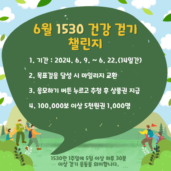 ‘1530 건강 걷기’는 1주일에 5일 이상 하루 30분 이상 걷기 운동을 의미하며, 챌린지는 광양시민이면 누구나 참여 가능하고 6월 9일~22일까지 총 14일간 진행된다.