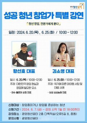 이번 특별 강연은 6월 20일과 25일 오전 10시에 2회에 걸쳐 청년꿈터에서 진행되며, 창업 초년생과 준비생을 대상으로 전라남도 내 창업에 성공한 선배 사업가들이 나와 자신이 직접 겪은 사례들과 창업에 관한 노하우를 이야기할 예정이다.
