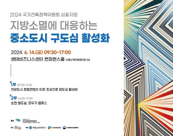 (전남=NSP통신) 남정민 기자 = 전남 순천시(시장 노관규)와 대통령 소속 국가건축정책위원회(위원장 권영걸, 이하 국건위)는 오는 14일 순천역 인근 생태비즈니스센터 컨퍼런스홀에서 지방소멸에 대응하는 ‘중소도시 구도심 활성화 심포지엄’을 개최한다고 11일 밝혔다.