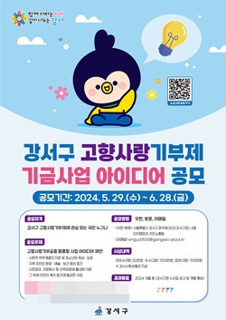 (서울=NSP통신) 강은태 기자 = 서울시 강서구(구청장 진교훈)가 오는 28일까지 ‘고향사랑 기금사업 아이디어 공모’를 진행한다.