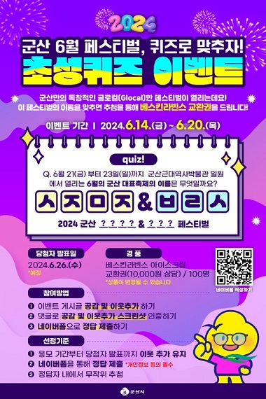 이번 이벤트는 ‘군산 6월 대표 페스티벌, 퀴즈로 맞추자! 초성퀴즈 이벤트’로 21일부터 23일까지 근대역사박물관 일원에서 열리는 축제 이름을 맞추면 된다.