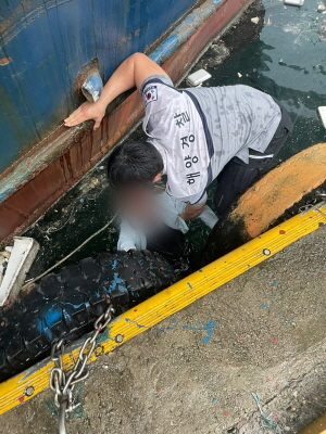 NSP통신-포항해경 관계자가 경주시 감포읍 감포항내에서 길을 걷다 추락해 완충용 타이어를 잡고 매달려 있는 B씨를 구조하고 있다. (사진 = 포항해양경찰서)