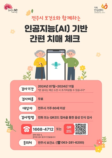 김신선 전주시보건소장은 “AI 간편 치매 체크는 누구나 스마트폰으로 쉽게 참여할 수 있어 치매 고위험군을 발굴하는 데 많은 도움이 될 것으로 기대된다”면서 “시간과 장소에 구애받지 않는 간편한 검사인 만큼 많은 시민의 관심과 참여를 바란다”고 말했다.