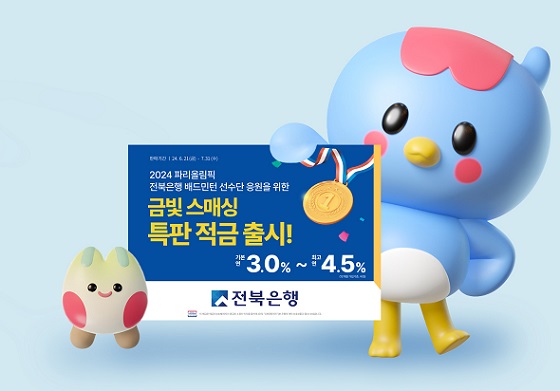 (전북=NSP통신) 김광석 기자 = JB금융지주 전북은행(은행장 백종일)이 2024 파리올림픽에 출전하는 전북은행 배드민턴 선수단의 선전을 기원하며 ‘금빛 스매싱 특판 적금’을 출시한다고 밝혔다.