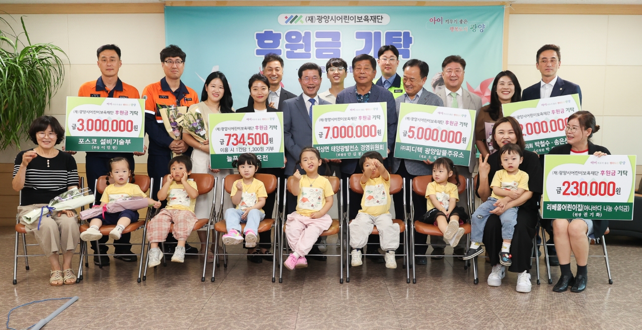 (전남=NSP통신) 김성철 기자 = 광양시어린이보육재단(이사장 이광용)은 지난 25일 정인화 광양시장, 이광용 이사장, 김희영 상임이사, 기탁자를 비롯한 관계자 20여 명이 참석한 가운데 후원금 기탁식을 가졌다.