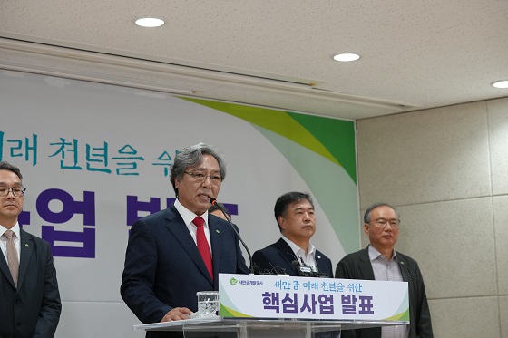 NSP통신-나경균 새만금개발공사 사장이 26일 기자회견을 열고 공사에서 추진 중인 핵심사업 계획을 밝히고 있다. (사진 = 새만금개발공사)
