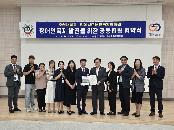 (전북=NSP통신) 김광석 기자 = 전북 군산 호원대학교(총장 강희성)와 김제시장애인종합복지관이 26일 김제시 장애인복지관에서 장애인복지 발전을 위한 공동협력 협약을 체결했다.