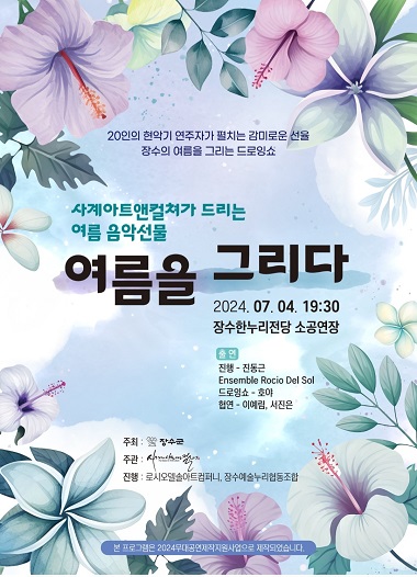‘2024년 무대공연작품 제작지원사업’을 통해 군이 주최하고, 사계아크앤컬처 주관으로 마련된 ‘여름을 그리다’는 클래식 음악 공연에 장수군의 여름을 주제로 그리는 드로잉쇼를 곁들인 순수예술 간의 합작 공연이다.