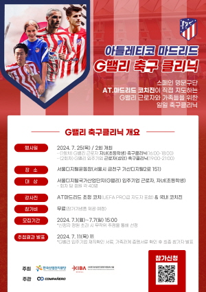 한국산업단지공단 서울지역본부, G밸리 대표 한국산업단지경영자연합회 서울(회장 박관병), AT마드리드 국내 협력사인 꼼빠네로(대표 변수연)가 지난 5월 관련 업무협약을 맺고, 축구를 사랑하는 G밸리 근로자와 가족에게 이번 축구클리닉을 무료로 제공한다.
