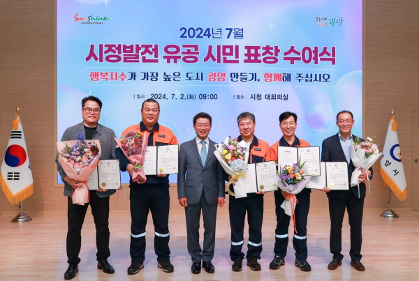 광양시청 대회의실에서 열린 7월 광양시 시정발전 유공자 시상식에서 이동호 광양제철소 차장, 정영수, 강효석, 서정원, 김기현 광양제철소 과장이 수상의 기쁨을 나눴다.