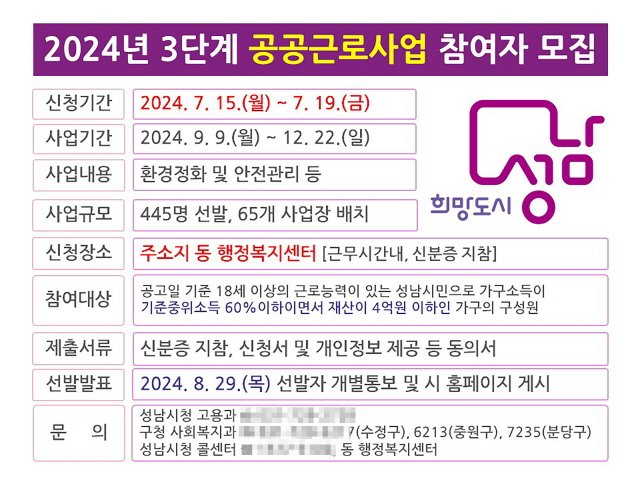 (경기=NSP통신) 김병관 기자 = 경기 성남시(시장 신상진)는 오는 15일부터 19일까지 ‘2024년도 3단계 공공근로사업’ 참여 희망자 445명을 모집한다.