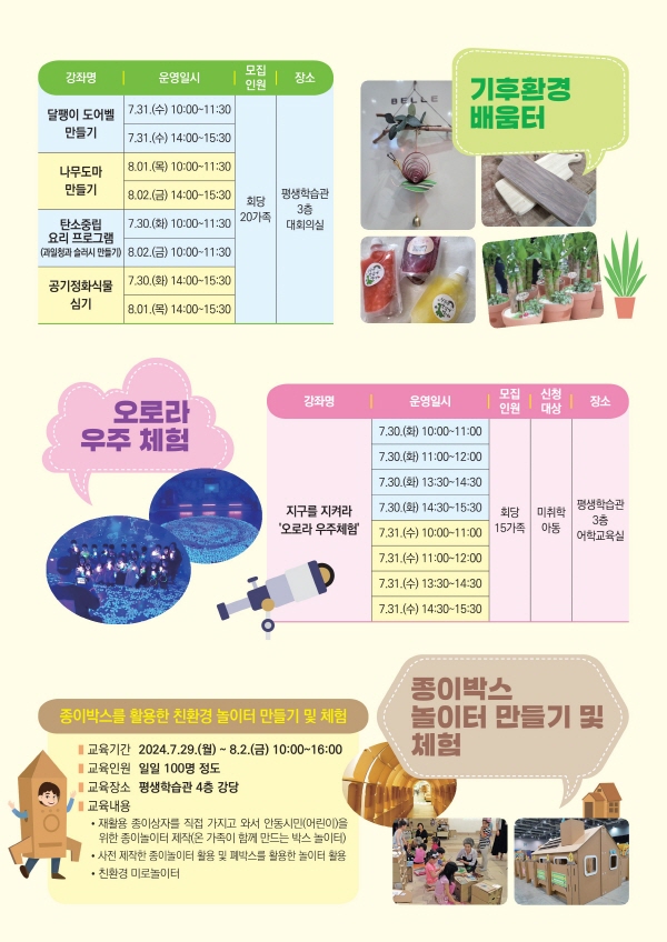 마지막으로 재활용 종이상자를 활용한 ‘친환경 놀이터 만들기 및 체험’ 으로 무더운 여름철 어린이들을 위한 친환경 놀거리를 제공할 예정이다.