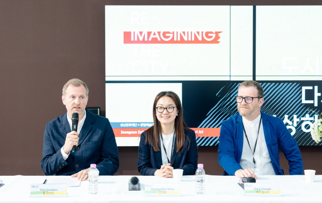 성남문화재단과 RCA가 공동 기획·개최한 ‘도시를 다시 상상하다’ 프로젝트에서 워크숍을 진행한 RCA 톰 사우든(왼쪽부터), 손경화 교수, RCA 게리 클라우. (사진 = 성남문화재단)