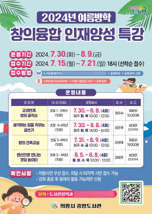 김성제 의왕시장은 “여름방학을 맞은 초등학생들을 위해 다양한 프로그램을 운영하오니 많은 어린이가 참여해 창의적인 인재로 자랄 수 있는 좋은 기회를 경험하길 바란다”고 말했다.