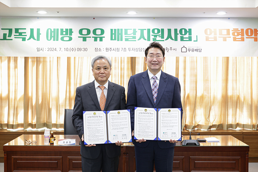 (강원=NSP통신) 조이호 기자 = 강원 원주시(시장 원강수)와 ‘어르신의 안부를 묻는 우유 배달(이사장 호용한)’이 10일 시청 투자상담실에서 ‘고독사 예방 우유배달 지원사업’ 협약을 체결했다.