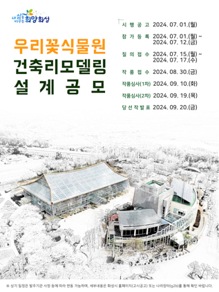 시는 설계공모를 통해 수준 높은 설계안을 제안 받아 우리꽃식물원의 고유 정체성을 살린 공간 디자인을 적용하고 이용객을 위한 차별화된 편의시설 및 체험공간을 도입할 계획으로 오는 10월 설계에 착수해 2026년 12월 준공을 목표로 리모델링을 추진하고 있다.