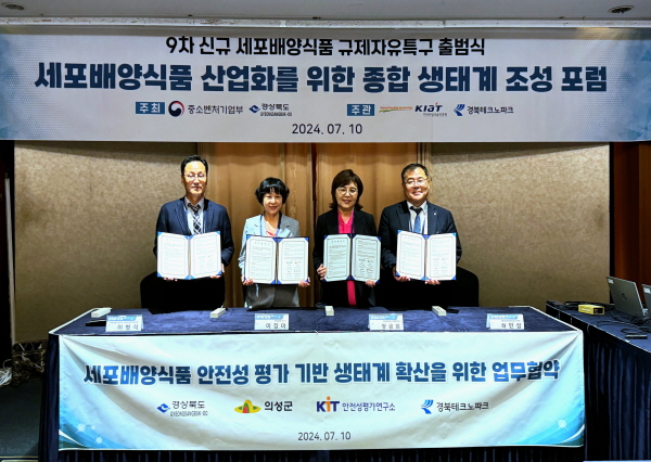 또한 경북도는 이날 세포배양 식품 특구를 공식 출범시키고, 2024년 6월부터 2028년 12월까지 4년 7개월간, 총 사업비 199억 원 규모로 의성군 바이오밸리산업단지 일원에서 혁신기업 10개 사가 참여해 세포배양식품 상용화 실증을 수행한다.