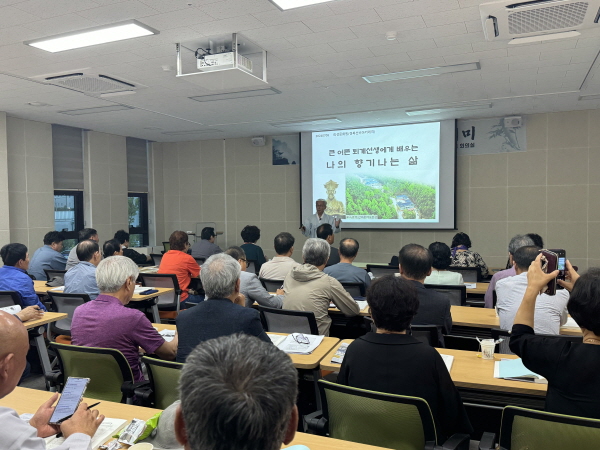 이날 ‘도산서원선비문화수련원’ 의 김병일 이사장이 '퇴계선생의 향기와 오늘날 우리가 배울 점' 을 주제로 첫 강의를 진행했다.