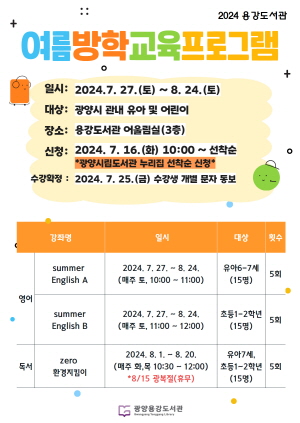 광양용강도서관, 2024년 여름방학 교육 프로그램 수강생 모집