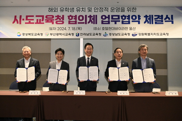 (경북=NSP통신) 조인호 기자 = 경상북도교육청(교육감 임종식)은 18일 울산광역시 호텔현대 바이라한에서 부산·전남·경남·강원교육청 등 4개 교육청과 해외 유학생 유치와 안정적 운영을 위한 업무협약(MOU)을 체결했다.