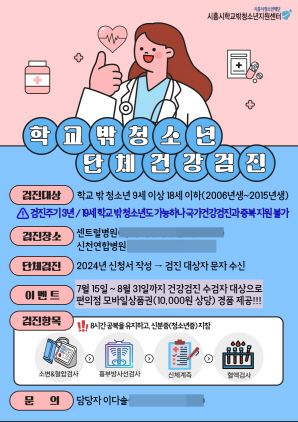 이에 학교밖센터에서는 8월에 단체 건강검진 이벤트를 운영함으로써 신규 및 미수검 대상자를 발굴, 지원할 계획이다.