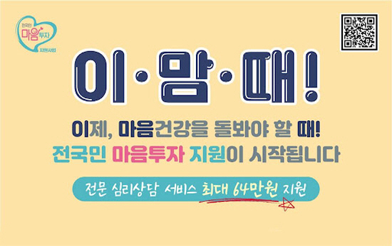전국민 마음투자 지원사업(‘이제, 마음건강, 돌봐야 할 때’)은 지난해 정부가 발표한 ‘정신건강정책 혁신방안’에 따라 국민의 마음건강 돌봄 및 정신질환 사전 예방과 조기 발견을 위해 추진하고 있다.