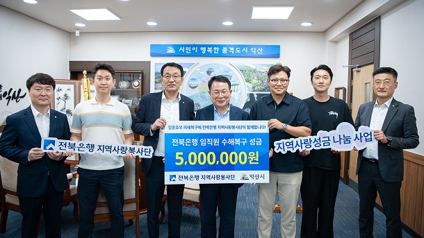 (전북=NSP통신) 김광석 기자 = JB금융그룹 전북은행 지역사랑봉사단(공동단장 백종일 은행장, 정원호 노조위원장)이 23일 익산시청 시장실에서 익산시 집중호우 피해복구를 위한 '직원 특별성금' 전달식을 실시했다.