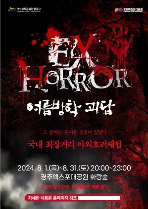 (경북=NSP통신) 조인호 기자 = 경상북도문화관광공사(사장 김남일)는 8월 1일부터 31일까지 한 달간 경주엑스포대공원 화랑숲에서 국내 최장거리 야외 호러 체험 ‘EXHORROR’가 진행된다고 밝혔다.