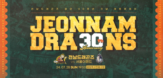 (전남=NSP통신) 김성철 기자 = 막강한 화력을 자랑하며 K리그2 2위를 유지하고 있는 전남드래곤즈(이하 전남)가 7월 28일 일요일 오후 7시 광양축구전용구장에서 K리그2 2024 25라운드 서울E와의 홈경기를 ‘레트로데이’로 치른다.