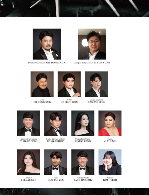 안양대 음악학과 성악전공 학생들의 이번 공연에서는 오동국 교수가 예술감독과 주인공(예수) 역을 맡고 최현석 교수가 작곡 및 대본을, 프로시노네 국립음악원 온석원 씨가 베드로 역을, 한재선 씨가 가롯 유다, 박진석 씨가 우편 강도, 강지훈 씨가 좌편 강도, 김사랑 씨가 막달라 마리아, 지 영 씨가 마리아, 이재은 씨가 안젤라, 구재윤 씨가 비자 역을, 김혜리 씨가 피아노를 연주한다.