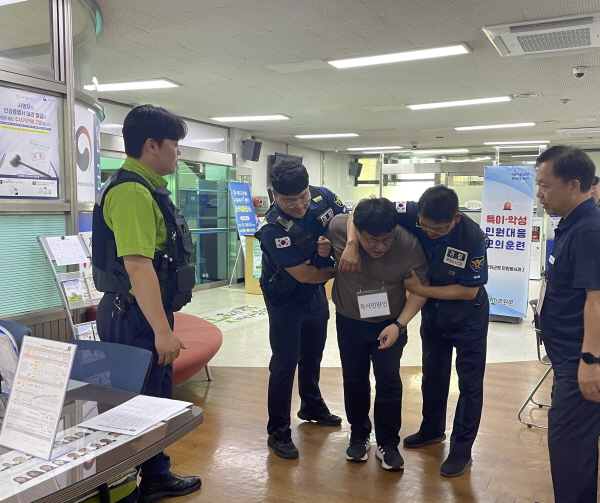이번 훈련은 민원인의 폭언 및 폭행 발생 상황을 가정해 녹음·녹화 실시, 비상벨 호출, 보안업체·경찰서 출동, 악성 민원인 연행 순으로 진행됐다.