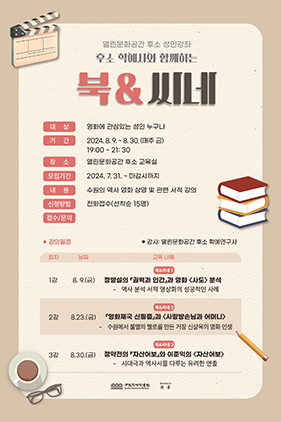 8월 9일 강의는 정병설의 ‘권력과 인간(2012)’과 영화 ‘사도(2015)’를 비교 분석하고 23일은 영화 ‘사랑방 손님과 어머니(1961)’와 책 ‘영화제국 신필름(2009)’을 주제로 신상옥 감독의 영화 인생 이야기를 들을 수 있다. 이어 30일에는 정약전의 어류백과사전 ‘자산어보(2021 국역판)’와 영화 ‘자산어보(2021)’를 다룬다.