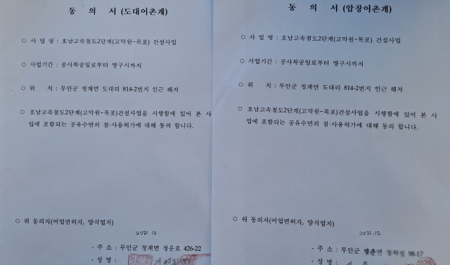 철도공사 해저구간 공유수면점사용협의 근거가 된 두장의 동의서 (사진 = 윤시현 기자)