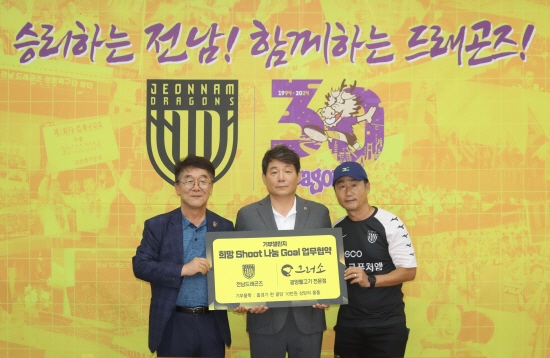 전남은 지난 26일 광양불고기 전문점 그러소(대표 배영진)와 ‘희망슛! 나눔골! 기부챌린지!’ 협약을 체결하며 지역사회의 소외계층을 위한 행보를 이어갔다.