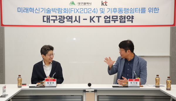 (경북=NSP통신) 김대원 기자 = 대구광역시는 KT대구경북광역본부와 함께 대구 중구에 위치한 KT플라자에서 ‘미래혁신기술박람회(FIX2024) 및 기후동행쉼터에 관한 업무협약(MOU)’ 을 체결했다.