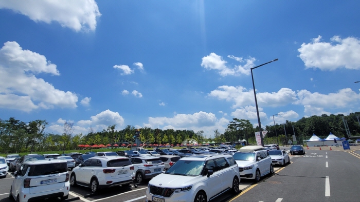 2일 오전 패밀리파크 주차장에 물놀이장 이용객들의 차량들이 주차된 모습. (사진 = 김두일기자)