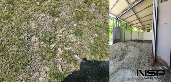 NSP통신-지난 5월 확인된 철새들의 배설물로 뒤범벅이 된 파주 NFC 천연잔디 구장(좌)과 파주 NFC 쓰레기 처리장에 쌓아둔 천연잔디 구장에서 수거한 철새들의 배설물 무더기(우) (사진 = NSP통신)