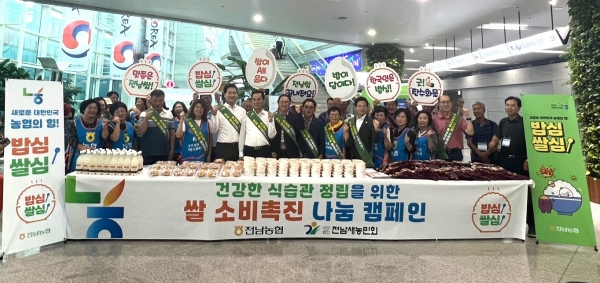 (전남=NSP통신) 김용재 기자 = 농협전남본부(본부장 박종탁)는 지난 6일 무안국제공항에서 한국새농민중앙회 전라남도회(회장 강제석) 회원 50명과 한국새농민중앙회 김안석 회장, 무안국제공항 윤상규 공항장 등이 함께한 가운데 쌀 소비촉진을 위한 캠페인을 전개했다.