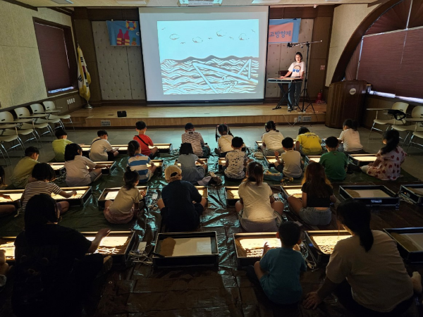 ▲모래예술 공연과 체험 프로그램은 초등학생 60명이 참여했으며 8월 4일에 1부와 2부로 나누어 공연, 모래를 이용한 그림 그리기 체험을 통해 신기함과 예술성을 흠뻑 느끼는 경험을 한 학생들이 즐거워했다.