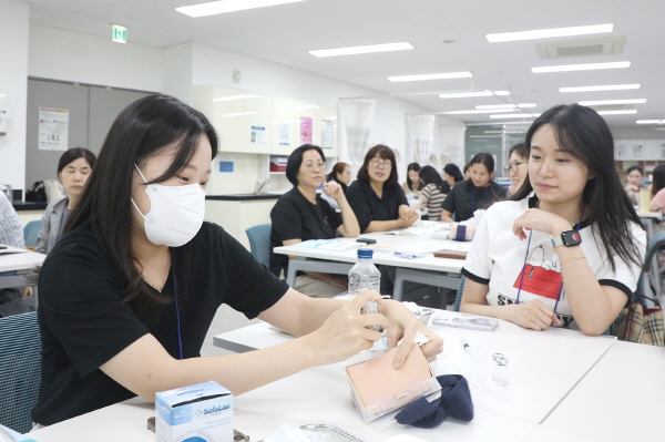 대구광역시 교육청 소속 보건교사 357명이 참석한 이번 직무연수는 ▲효율적인 보건실 운영 ▲전자담배 및 신종마약 노출 예방 전략 ▲에듀테크를 활용한 수업 및 업무 역량 강화 ▲학생 응급상황 의료행위 실습 등 보건교사 업무 역량을 강화할 수 있는 맞춤형 주제로 진행됐다.