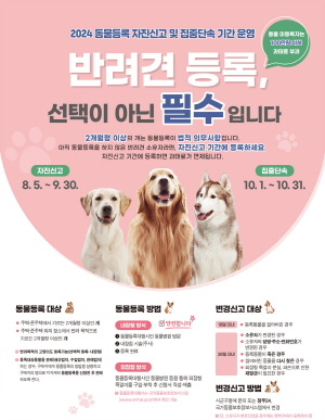 송명종 농업정책과장은 “동물등록은 반려 견주가 반드시 준수해야 하는 법적 의무다”며 “책임감 있는 반려동물 문화 정착을 위해 동물등록을 완료하고 반려견 동반 외출 시 목줄 착용(2미터 이내), 배설물 수거하는 등 펫티켓을 함께 지켜 주시기를 바란다"고 말했다.