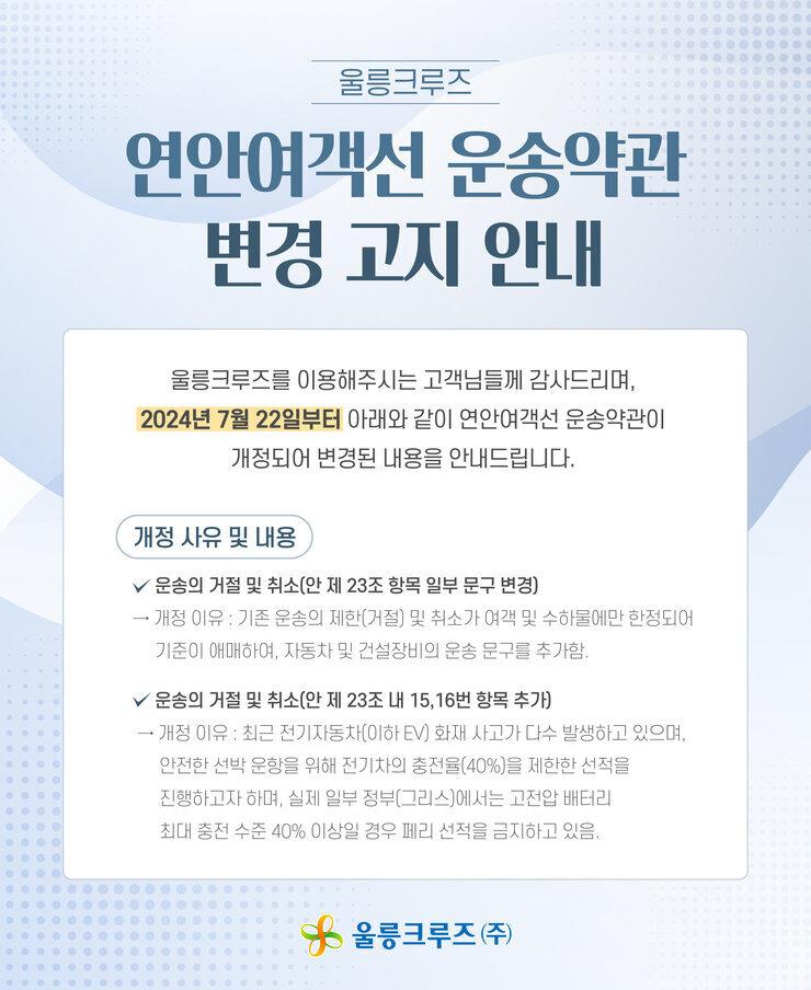울릉크루즈는 홈페이지를 통해 충전율 40% 이하인 전기차만 선적이 가능하다고 발표했다.