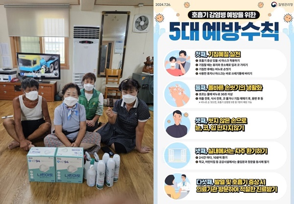코로나19 예방수칙(우)과 경로당 등애 지급된 KF94 마스크(좌) (사진 = 파주시)